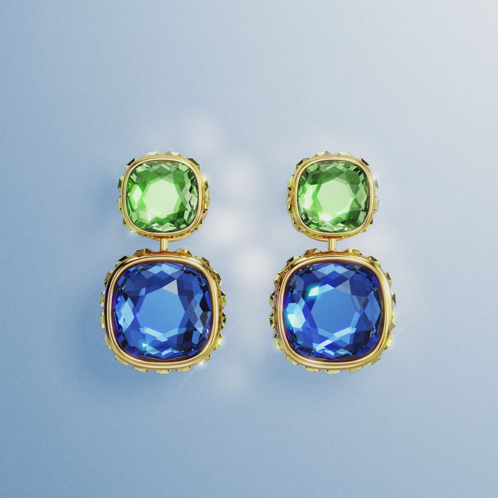 With different colours on each side, these Chroma Twist pierced earrings are wonderfully versatile. Each gold-tone plated piece connects to the ear with a Swarovski ReCreated™ crystal in green. Below, the reversible design means you can either display a Swarovski ReCreated™ crystal in blue or a vibrant crystal in pink. The choice is yours. Create playful pairings with other jewellery from this collection and let your joyful side shine. Chroma Twist jewellery contains at least 50% Swarovski ReCreated™ crystals, and it is our first collection designed with circularity in mind.
